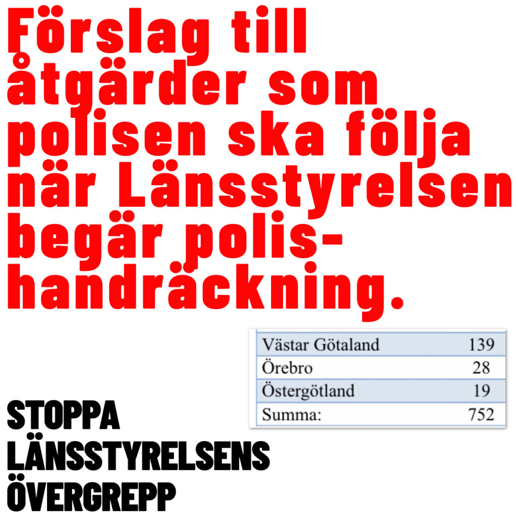 1. När Länsstyrelsen begär handräckning måste underlaget till begäran granskas. Det har visat sig att Länsstyrelsen ofta ljuger i sina påståenden om skäl till polishandräckning. Det kan röra sig om grundlösa påståenden om att djurägare tidigare hindrat besök etc.