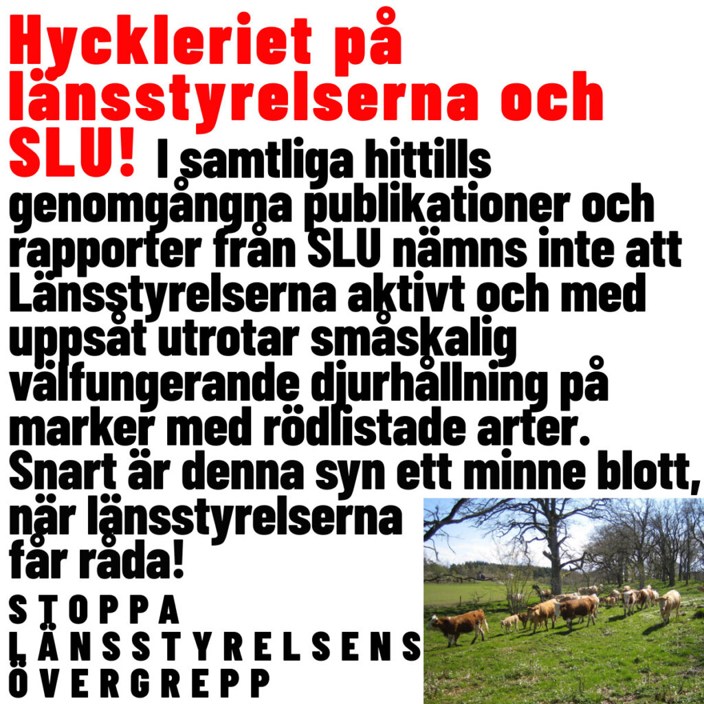 I samtliga hittills genomgångna publikationer och rapporter från Sveriges Lantbruksuniversitet SLU nämns inte att Länsstyrelserna aktivt och med uppsåt utrotar småskalig välfungerande djurhållning på marker med rödlistade arter.