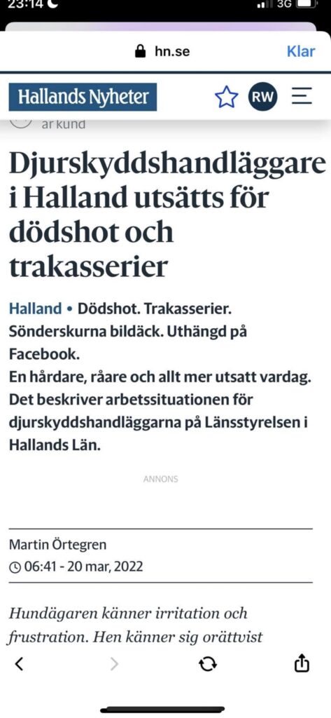 Budskapet är att djurskyddshandläggare känner sig hotade av djurägare. Här har Hallands nyheter låtit sig luras häromdagen. Det är intressant hur tjänstemän med sådana maktbefogenheter som kan krossa företag och människors liv kan känna sig hotade!