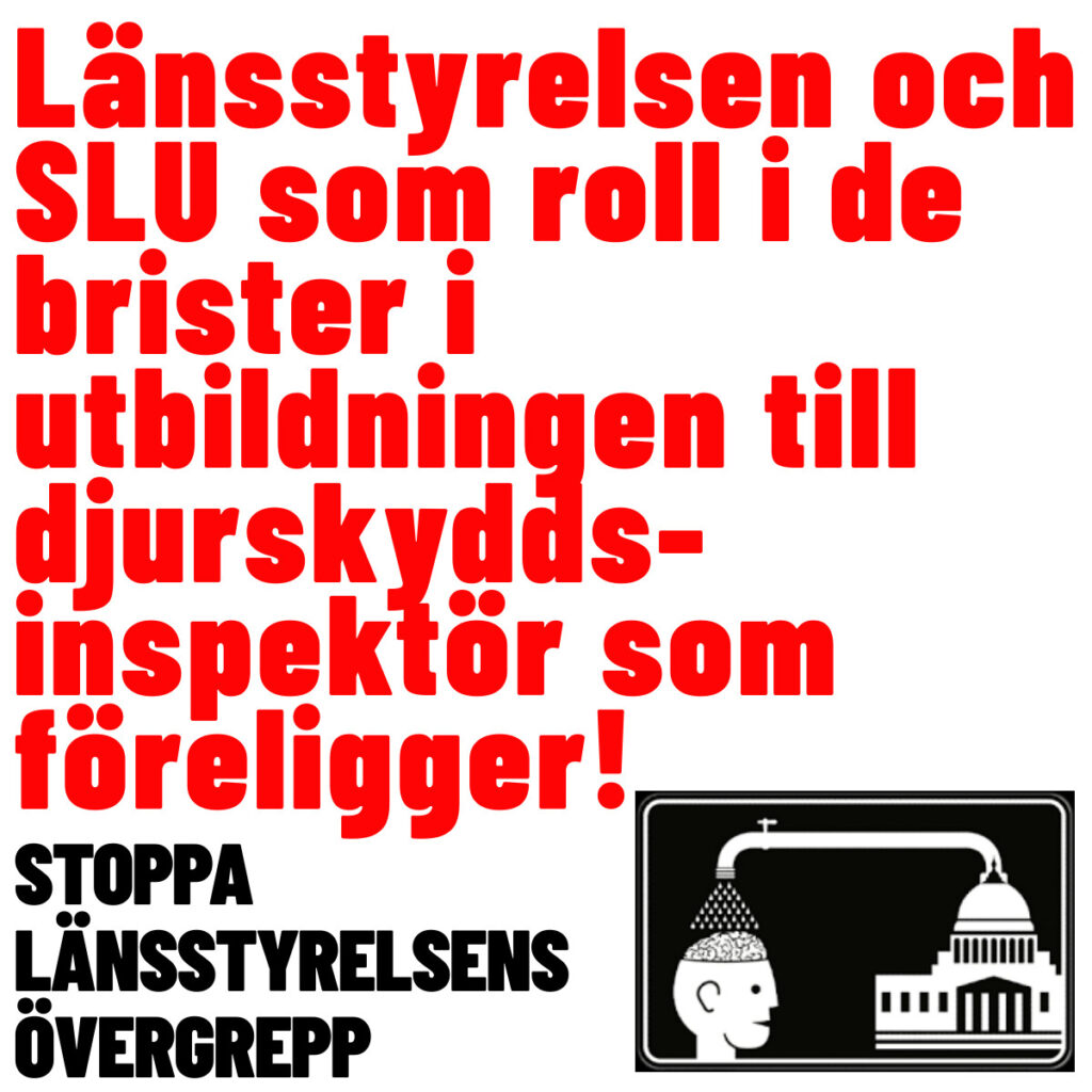 Det finns mycket att ta till orda när det gäller utbildning inom djurskyddet som till exempel djurskyddsinspektör. Studerar man innehåll och utbildningsmaterial framgår en tydlig vinkling och snedvridning åt objektifiering av djurhållare samt frammaning av industriell djurhushållning. Utbildningsmaterial är inbland inhämtat från djurrättsorganisationer och studenter kommer ofta från dessa miljöer vilket påverkar den framtida yrkesrollen i en djurägarfientlig riktning. Detta är svårt att leda i bevis men berättade erfarenheter från SLU talar starkt för att så är fallet.