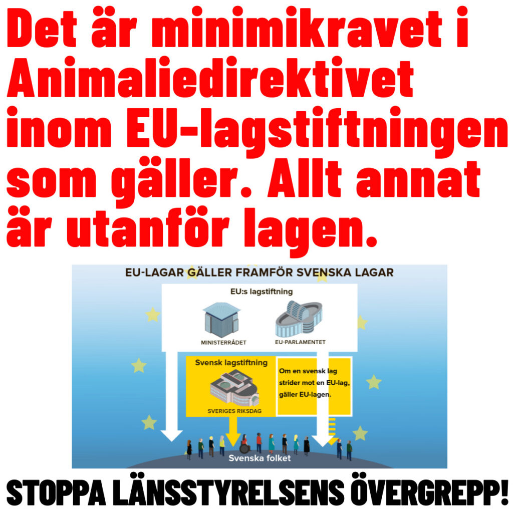 Djurskyddslagen i Sverige är inte en lag i ordets rätta bemärkelse och det är inte djurskyddslagens minimikrav som gäller som vissa djurskyddsinspektörer tycks tro. Djurskyddslagen är teknisk föreskrift som inte anmälts till EU och därmed aldrig godkänts av EU. Som teknisk föreskrift är den också underställd EU:s. Animaliedirektiv 98/58EG och kontrollförordning 625/2017EU.